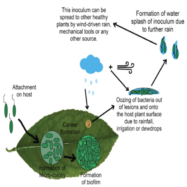 • Caused by Xanthomonas citri (bacteria), spreading by wind, rain, insects, pruning.